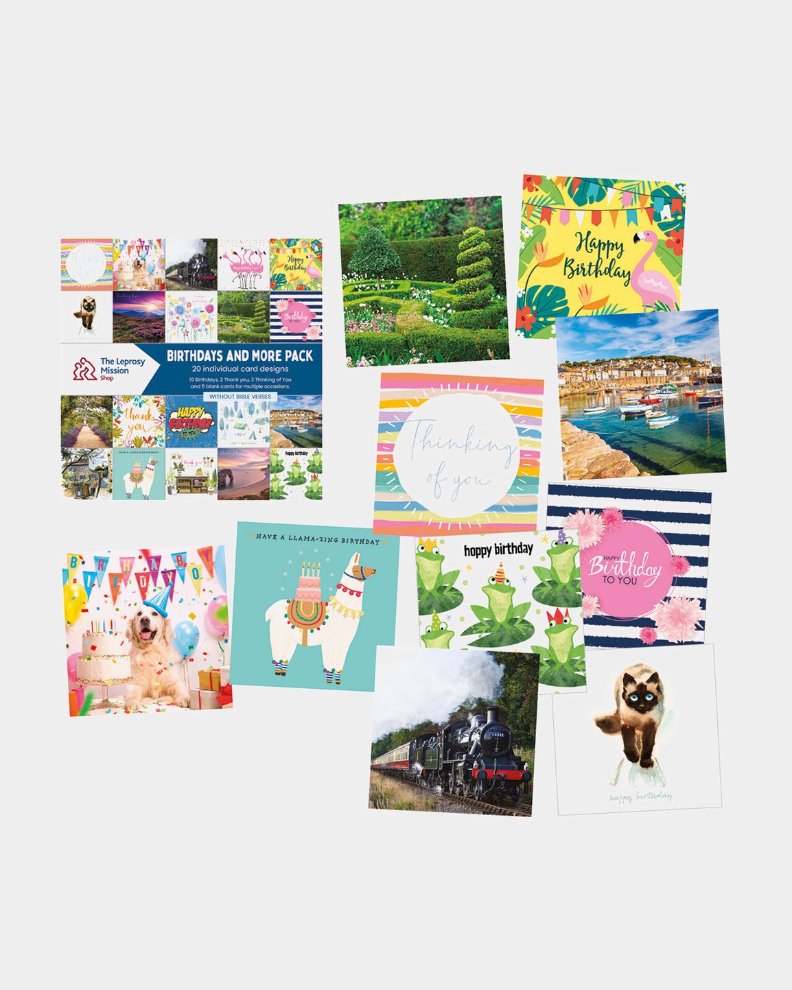 Pack of 20 Everyday cards. 1 each of 20 designs 10 Birthdays, 3 Thinking of You, 2 Thank You and 5 Blank cards for multiple occasions. Printed without Bible verses. Card size: 15 x 15 cm. Printed in the UK on FSC paper.